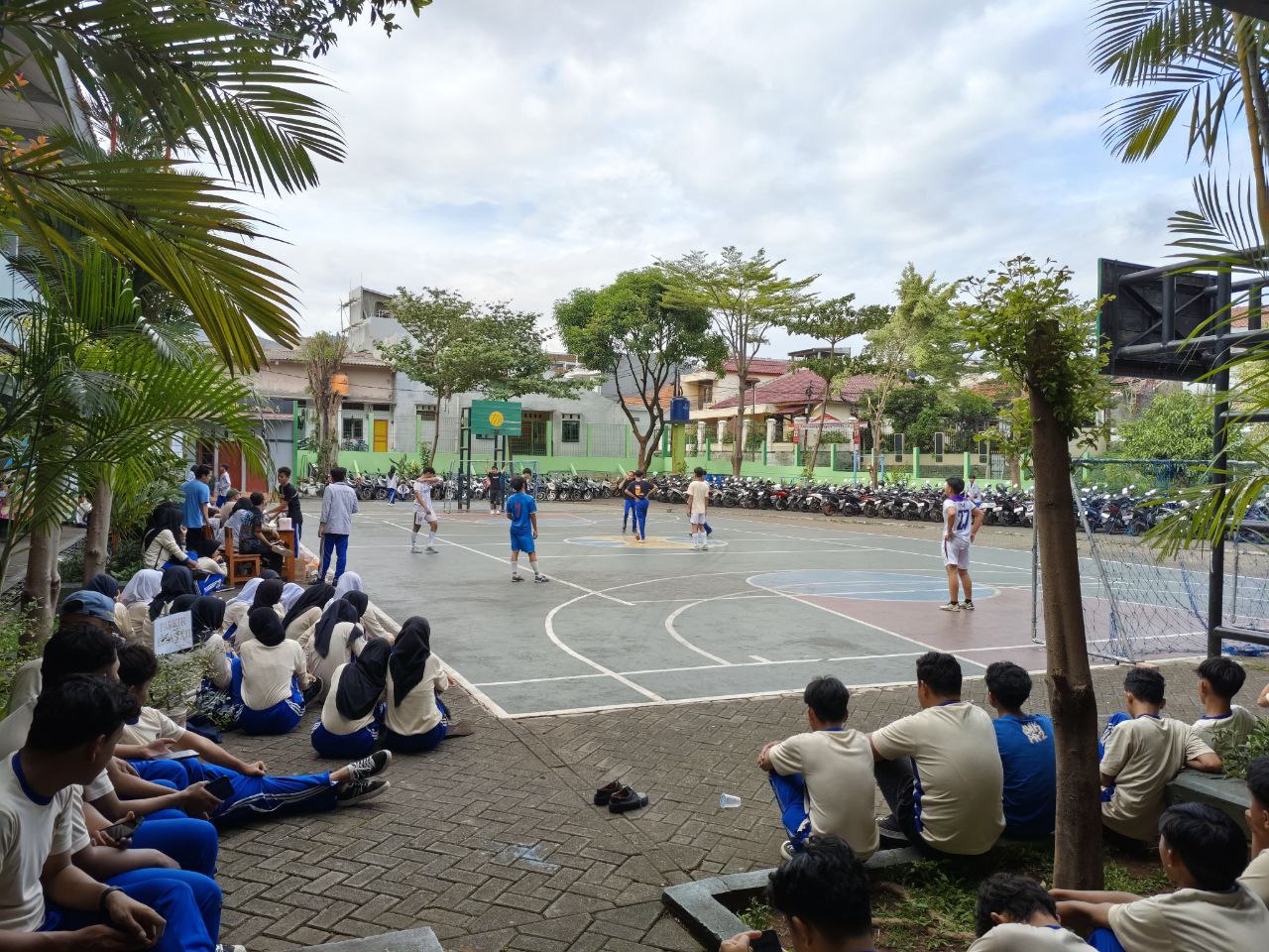 Foto lapangan olahraga di SMK Perguruan Rakyat menampilkan fasilitas yang luas dan terawat, ideal untuk berbagai kegiatan olahraga. Lapangan ini dilengkapi dengan markah yang jelas untuk permainan seperti sepak bola, basket, atau voli. Area sekelilingnya tertata rapi dengan ruang untuk penonton atau kegiatan pendukung lainnya. Dikelilingi oleh pagar pembatas, lapangan ini memberikan rasa aman bagi para siswa yang berolahraga. Kondisi lapangan yang baik dan suasana yang terbuka menciptakan lingkungan yang mendukung kesehatan dan semangat tim.
